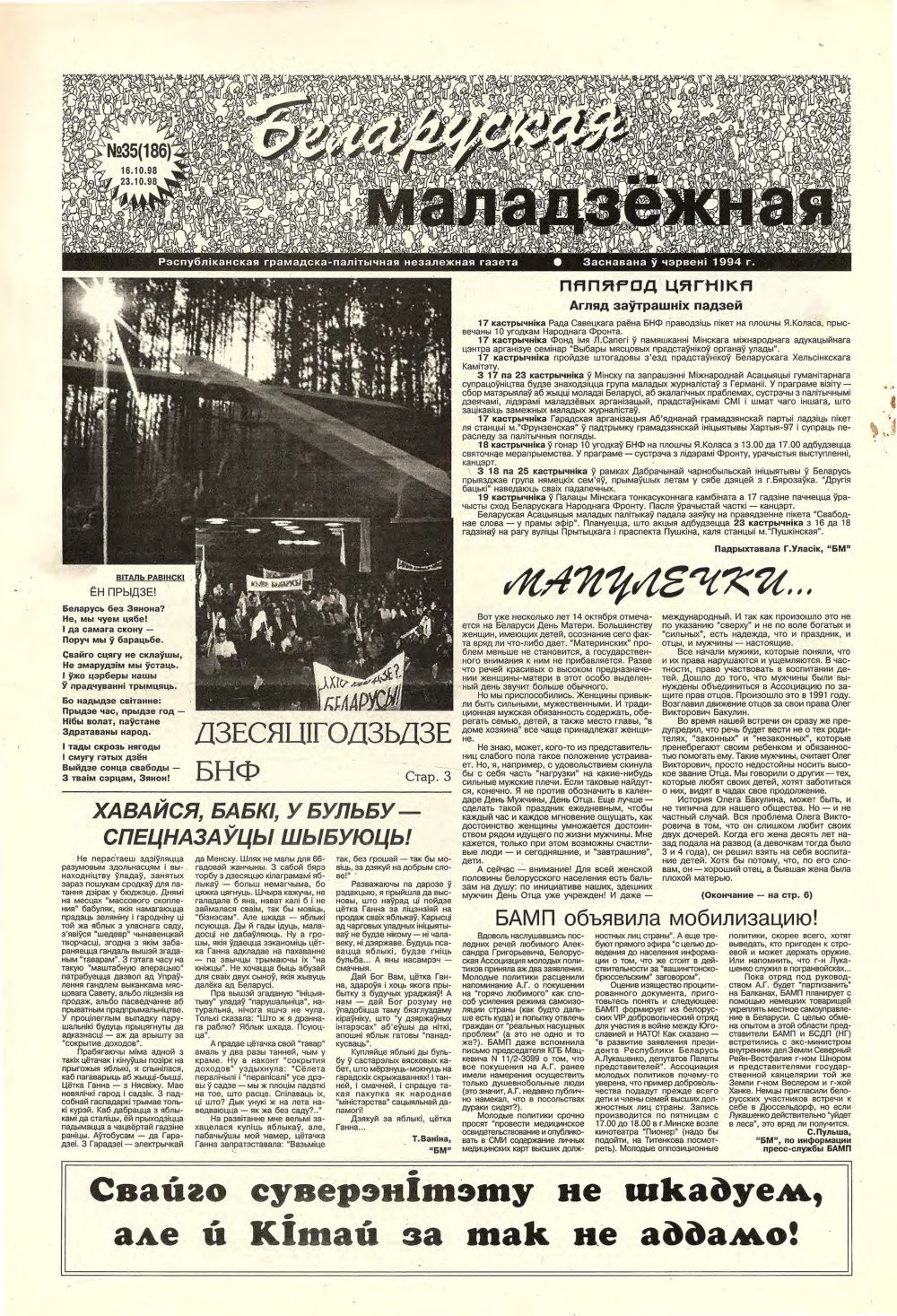 «Беларуская маладзёжная» (1994 - 2002) — беларуская газэта, дадатак да аднайменнай радыёстанцыі. Зарэгістраваная ў сакавіку 1994 году. У ёй друкаваліся расшыфроўкі радыйных гутарак, анонсы этэраў і ўсё, што не зьмяшчалася ў радыёфармат. Калі радыёстанцыю зачынілі, газэта засталася. Галоўны рэдактар — Тацьцяна Мельнічук. Традыцыйны фармат — 8 старонак А3. Газэта асьвятляла нараджэньне й разьвіцьцё палітычнай апазыцыі сярэдзіны-канца 1990-х, дзейнасьць незарэгістраваных моладзевых аб'яднаньняў з усіх бакоў палітычнага сьпектру, сачыла за разьвіцьцём й актуальным станам альтэрнатыўнай моладзевай культуры Беларусі. З 1995 па 1998 рэдакцыя газэты праводзіла у Менску вулічны рок-фэст «Купальле з Беларускай маладзёжнай». Апошні нумар выйшаў у чэрвені 2002 году. У кастрычніку 2003 году пасьведчаньне аб рэгістрацыі было скасаванае міністэрствам інфармацыі РБ. Крыница: be-tarask.wikipedia.org