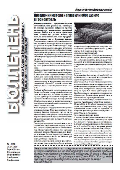 Бюллетень издаётся на пожертвования добрых людей -- наших предпринимателей. Он не самоокупается и не приносит прибыль, поэтому нуждается в постоянной поддержке. В связи с этим редакция бюллетеня и Координационный Совет Индивидуальных Предпринимателей г. Минска выражает огромную благодарность за оказываемую помощь! Спасибо Вам!!!