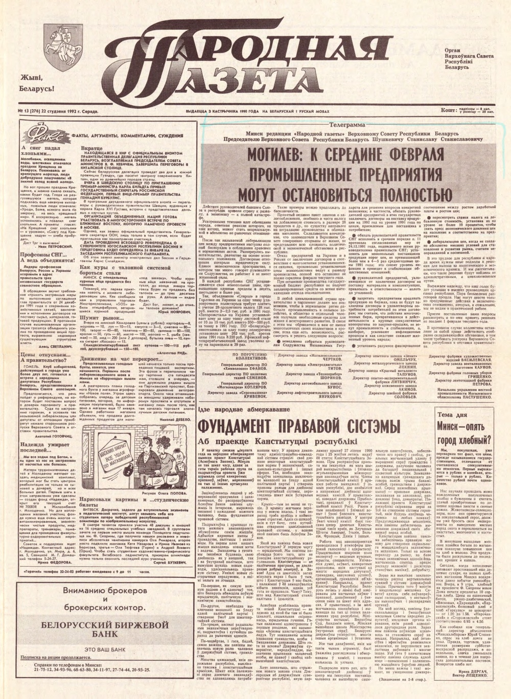 «Народная газета» — орган Вярхоўнага Савета Рэспублікі Беларусь. Выдавец: Адкрытае акцыянернае таварыства Народная газета. Выходзіць штодзённа, акрамя нядзелі і панядзелка, 250 разоў у год. Выдаецца з кастрычніка 1990 года на беларускай і рускай мовах. З 1990 па 1995 год пасаду галоўнага рэдактара «Народнай газеты» займаў Іосіф Сярэдзіч. З мая 1990 па студзень 1996 — дэпутат Вярхоўнага Савета XII склікання. Выданне займала ўмераную цэнтрысцкую пазыцыю, імкнучыся адлюстраваць палітычныя погляды большасці грамадзян. 17 сакавіка 1995 г. Указам № 113 Аляксандр Лукашэнка прызначыў галоўным рэдактарам «Народнай газеты» Мікалая Галко, не зважаючы на тое, што правам прызначаць галоўнага рэдактара сваёй уласнай газеты валодаў толькі Вярхоўны савет.