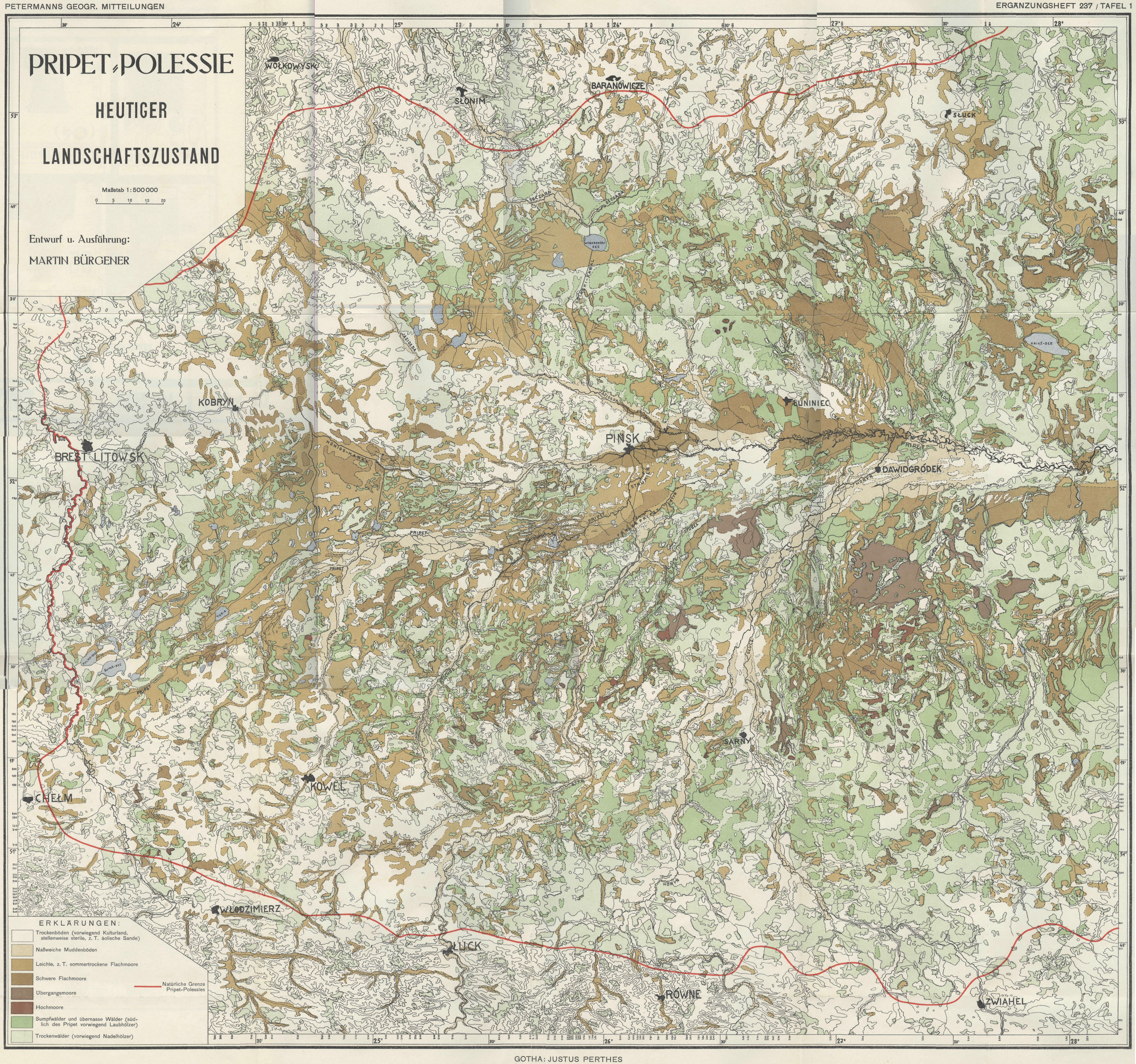 Pripet-Polessie — oder schlechthin „Polesie", wie die Polen den ihnen im Kigaer Vertrage von 1921 zugesprochenen Teil des großen Sumpf- und Waldlandes um Pripet und Dniepr nennen, ist einer der eigenartigsten und politisch bedeutungsvollsten Landesteile des neuen Polen. Von besonderer Eigenart, weil dieses durch seine außergewöhnlich starke Vermoorung und landschaftliche Abgeschlossenheit gegen außen hin gekennzeichnete Land als wahrscheinliche Urheimat der Slawen heute eines der am wenigsten entwickelten und urtümlichsten Gebiete Europas ist, das sich als eine große Insel inmitten der hochdifferenzierten ulturlandschaften des europäischen Festlandes weithin den Charakter einer ursprünglichen Naturlandschaft bewahrt hat und an dem frühgeschichtlichen, ja oft geradezu vorgeschichtlichen Habitus seiner Bevölkerung die Entwicklungsvoraussetzungen slawischer Kultur gut erkennen läßt.