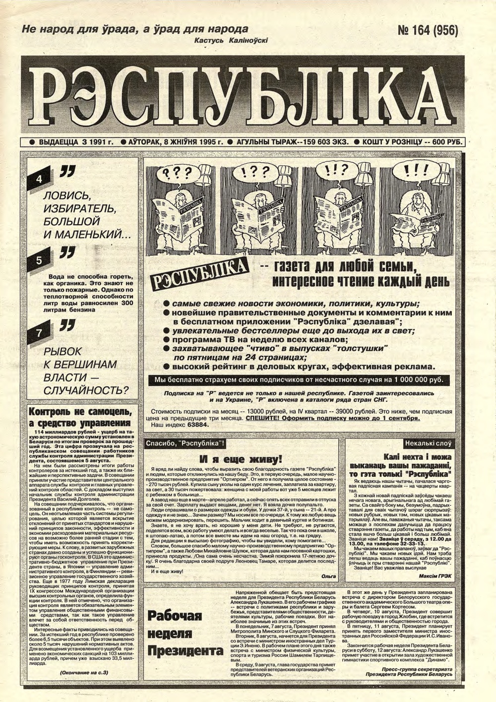 «Рэспубліка» — газета для тых, хто самастойна прымае рашэнні. Заснавальнік - Савет Міністраў Рэспублікі Беларусь. Выдаецца з чэрвеня 1991. Газета выходзіць 250 разоў у год. Аўтары апублікаваных матэрыялаў нясуць адказнасць за падбор і дакладнасць фактаў, іх меркаванні неабавязкова адлюстроўваюць пункт гледжання рэдакцыі. Рукапісы, фотаздымкі і малюнкі не рэцэнзуюцца і не вяртаюцца.