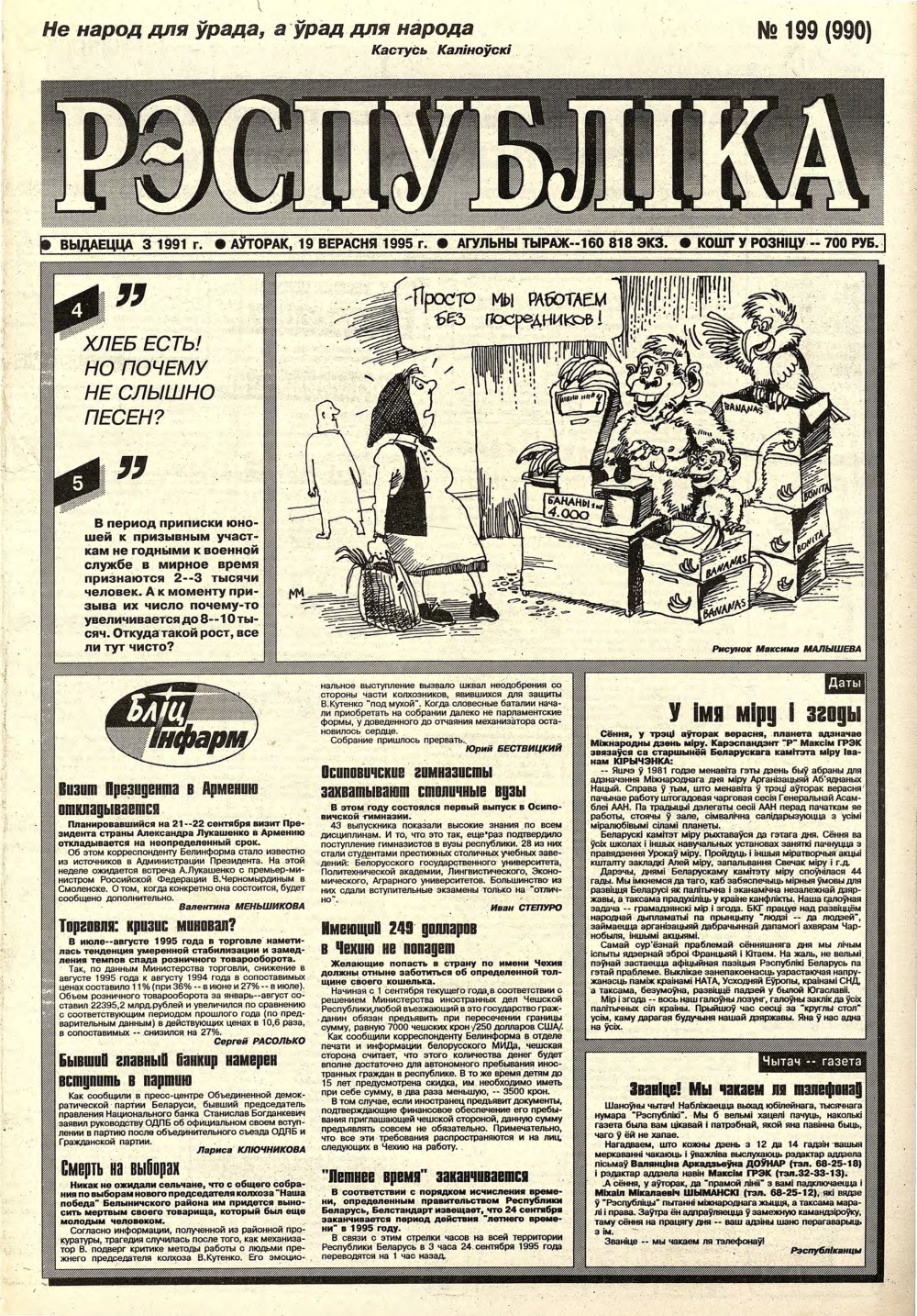 «Рэспубліка» — газета для тых, хто самастойна прымае рашэнні. Заснавальнік - Савет Міністраў Рэспублікі Беларусь. Выдаецца з чэрвеня 1991. Газета выходзіць 250 разоў у год. Аўтары апублікаваных матэрыялаў нясуць адказнасць за падбор і дакладнасць фактаў, іх меркаванні неабавязкова адлюстроўваюць пункт гледжання рэдакцыі. Рукапісы, фотаздымкі і малюнкі не рэцэнзуюцца і не вяртаюцца.