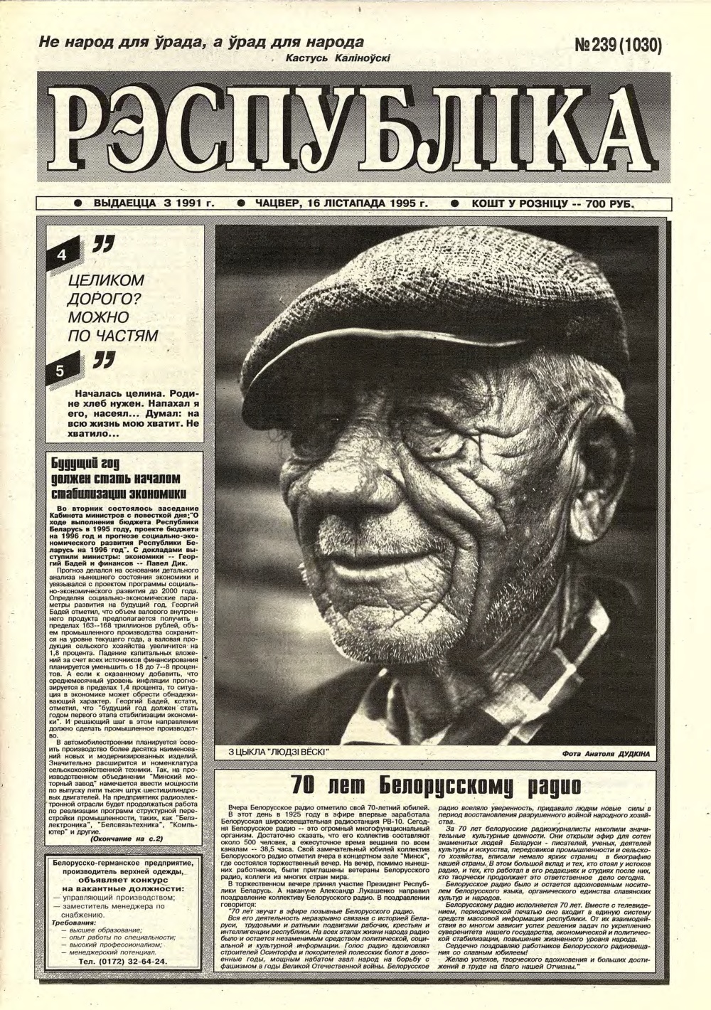 «Рэспубліка» — газета для тых, хто самастойна прымае рашэнні. Заснавальнік - Савет Міністраў Рэспублікі Беларусь. Выдаецца з чэрвеня 1991. Газета выходзіць 250 разоў у год. Аўтары апублікаваных матэрыялаў нясуць адказнасць за падбор і дакладнасць фактаў, іх меркаванні неабавязкова адлюстроўваюць пункт гледжання рэдакцыі. Рукапісы, фотаздымкі і малюнкі не рэцэнзуюцца і не вяртаюцца.