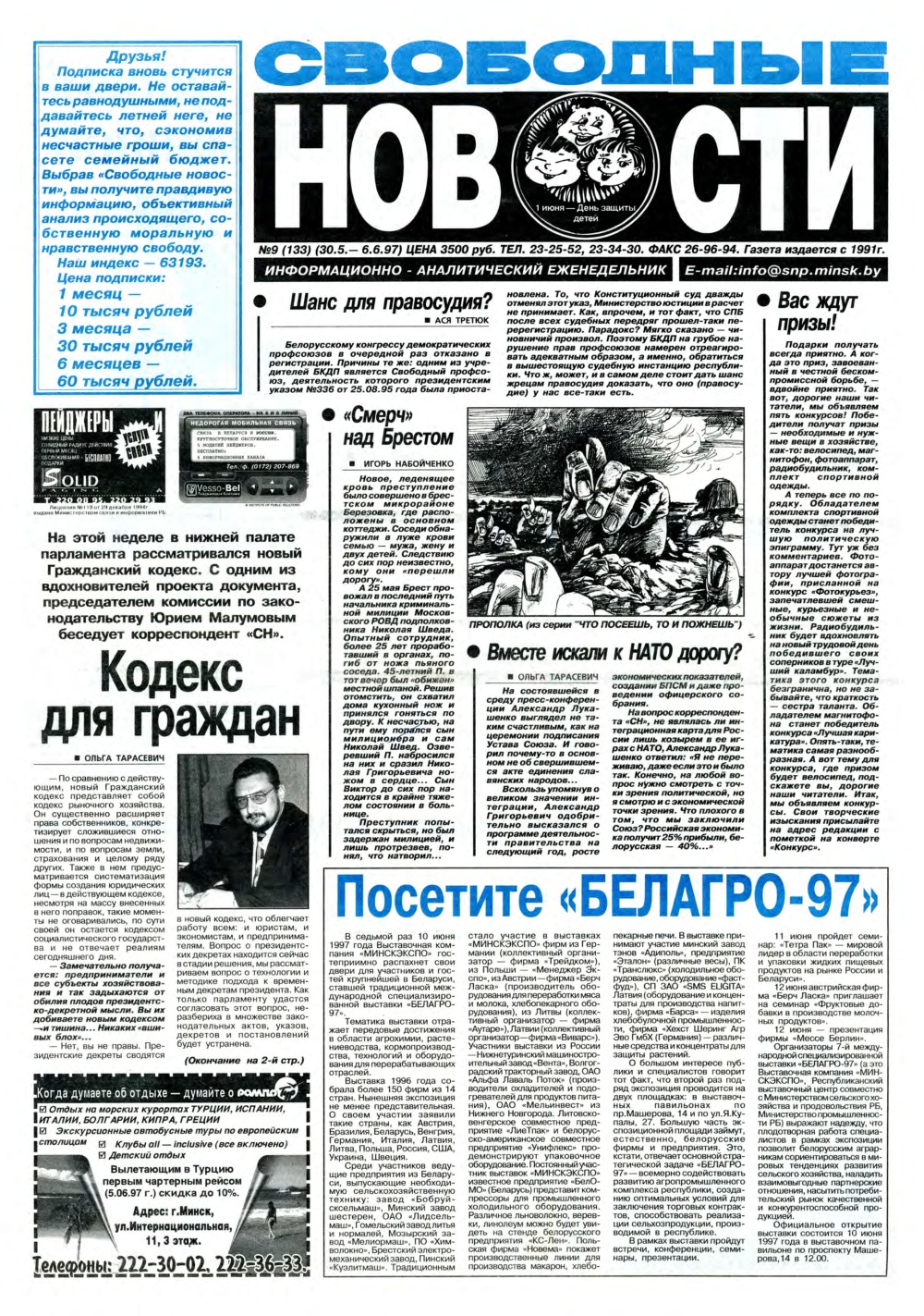 «Свободные новости плюс» — информационно-аналитический еженедельник. Издается с сентября 2002 года. Учредители: Белорусская научно-промышленная ассоциация и промышленно-коммерческая компания «Белфакс». За текст рекламы несет ответственность рекламодатель.