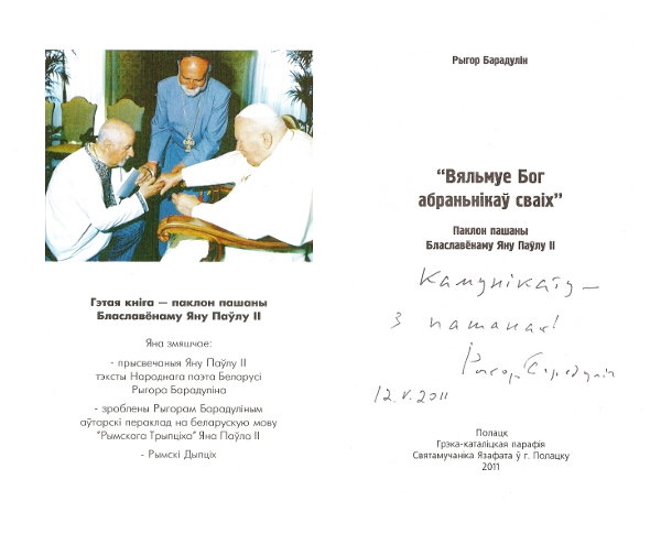 Гэтая кніга - паклон пашаны Блаславёнаму Яну Паўлу ІІ. Яна змяшчае: Прысвячаныя Яну Паўлу ІІ тэксты Народнага паэта Беларусі Рыгора Барадуліна. Зроблены Рыгорам Барадуліным аўтарскі пераклан на беларускую мову “Рымскага Трыпціха” Яна Паўла ІІ і Рымскі Дупціх. Кніга выдадзеная з нагоды бэатыфікацыі Папы Яна Паўла ІІ.
